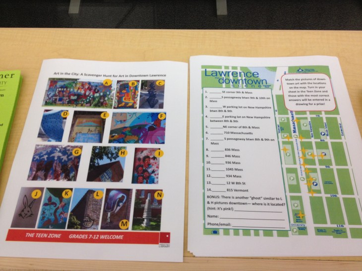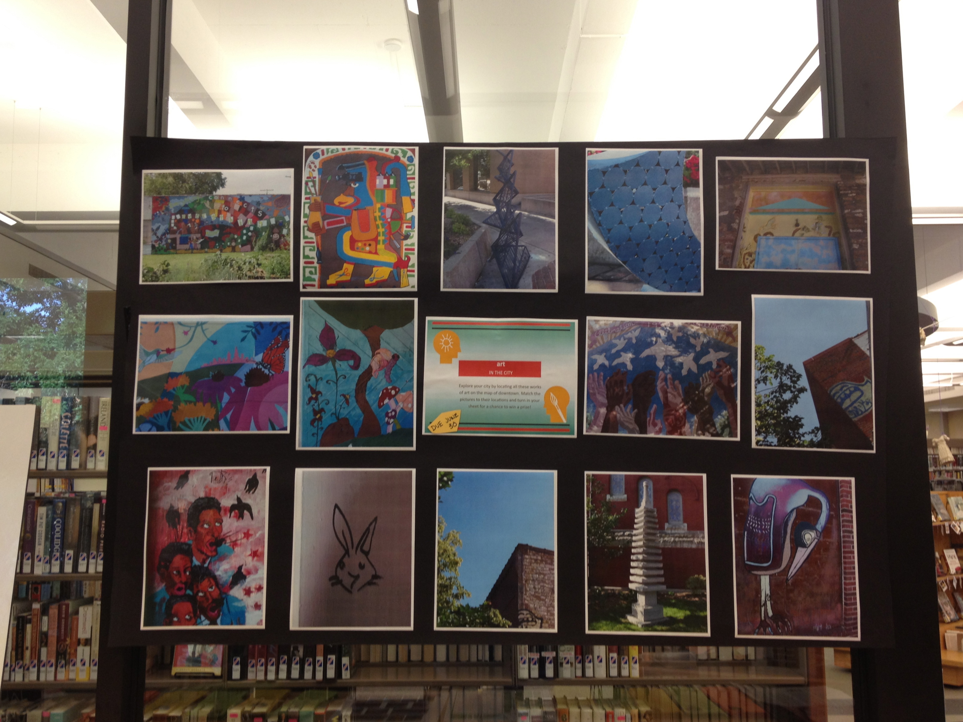 For the Teen Zone (where I work as a YA assistant) I developed a Art in the City scavenger hunt. Since the library is nestled in our picturesque downtown, which is full of murals and sculptures and graffiti art, it was a fun activity to get kids out of the library (and off the computers and video games) to explore their city. I took photographs of various art downtown, then created a map that marked each piece’s approximate location on the map. The photographs were displayed on our programming window in the library and on our Facebook page. Kids could take a sheet of small images of the art and the map around downtown and match the works of art with their location. Teens had an opportunity to use their map reading skills in a fun way. Everyone who turns in a completed map is entered in a prize drawing.