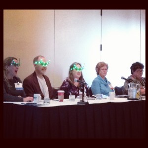 AS King, Scott Westerfeld, and Helen Frost wearing glow in the dark flashing glasses at 2012 Young Adult Literature Symposium November 6, 2012 Published by Molly Wetta Feminist gemini vegetarian librarian. View all posts by Molly Wetta