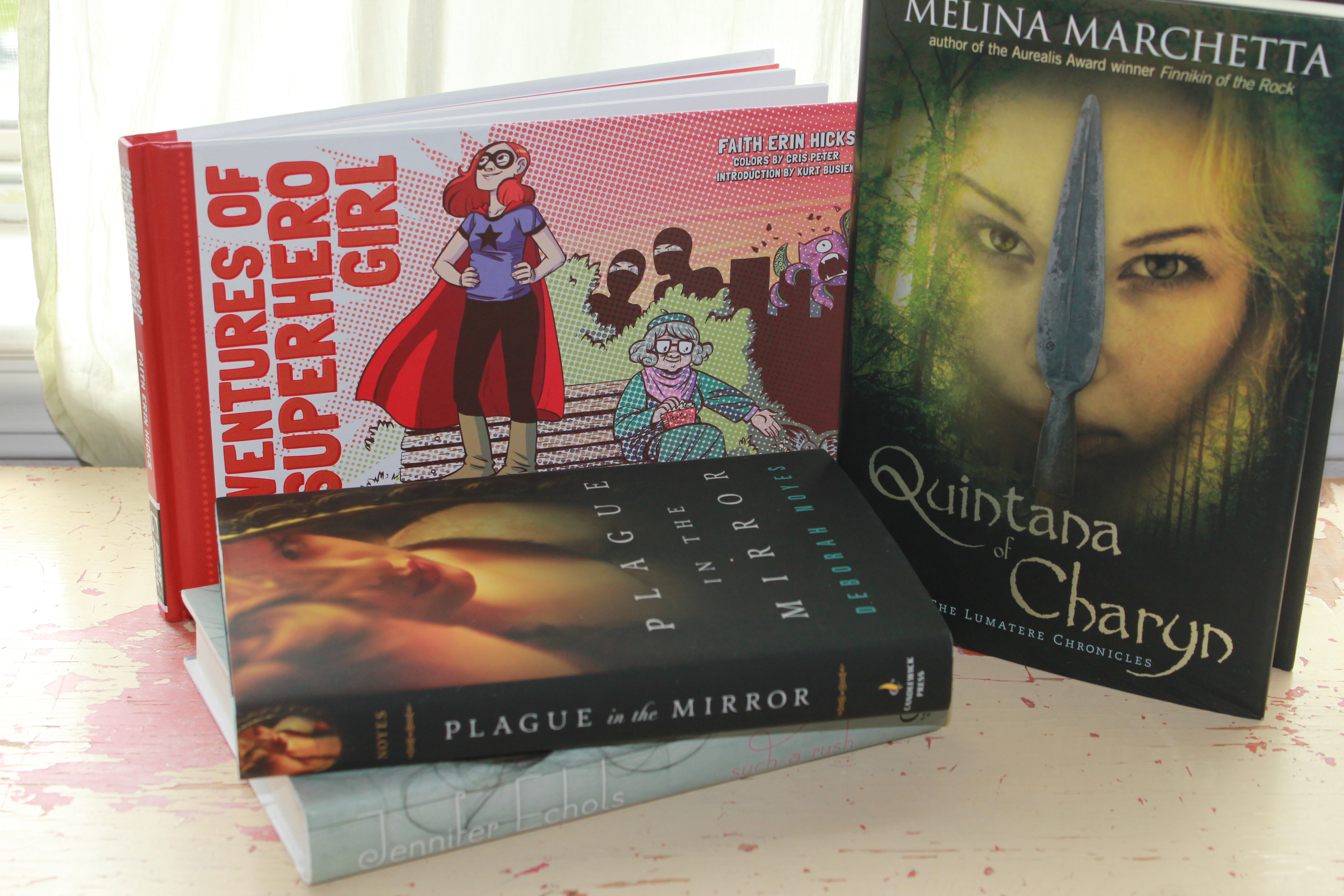 Adventures of Superhero Girl by Faith Erin Hicks | Quintana of Charyn by Melina Marchetta | Plague in the Mirror by Jen Noye | Such a Rush by Jennifer Echols