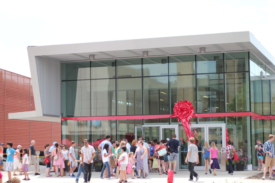 We opened last Saturday, and it’s been incredibly overwhelming to see the community’s reaction. We started the day off with a book relay, where families passed the last book to be added to the shelves—Where the Wild Things Are—and then our director yelled “Let the wild rumpus begin!” and the ribbons were cut, and we welcomed over 12,000 people into the new library.