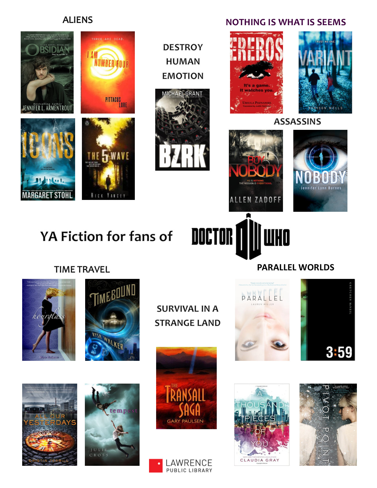 This weekend is Doctor Who Comics Day, and we’re having a day of passive programming to celebrate. We’ll have Doctor Who Guess Who (A modified version the teen librarian made) as well as some crafty stuff set out all day. We’ve done a Doctor Who themed party for the 50th Anniversary in November 2013 and teens loved it, so I anticipate this will be a hit, too. This is the accompanying booklist I made in Bibliocommons, and the graphic below lives in our readers’ advisory booklist binder. I’ve divided it by various themes that crop up in Doctor Who. There’s also this cool list made by the Denver Public Library for Denver Comic Con that includes book recommendations by Doctor. There’s some titles that also made my list, but also more suggestions on this list at Teen Librarian Toolbox and a follow up list.