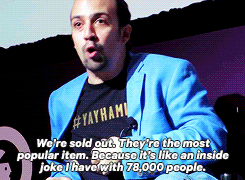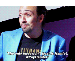 One reason LMM is successful? is constantly sharing inside, behind the scenes info and stories with his followers. These gifs are about a story he shared on Twitter about a woman yelling “congrats on Hamlet” to him while driving by the theater. He hashtagged it, and they sold shirts that people went crazy for because they got the joke.